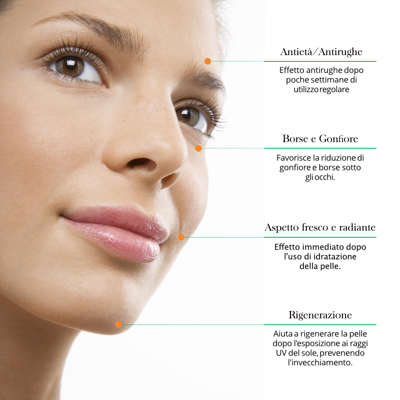 Efficace antiossidante che aiuta a proteggere le cellule dai danni causati dai radicali liberi contrastando l’invecchiamento cutaneo. Favorisce la formazione di collagene. - Vitamina E